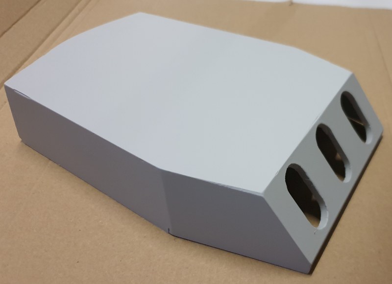 Die nach Papiervorlage von Hand ausgesägten Teile des Turmgehäuses aus 1,5 mm Alublech waren einerseits zu ungenau, andererseits hatte ich aufgrund der schmalen Kanten Probleme, die Teile einigermaßen dauerhaft zusammenzukleben. Immerhin war ja geplant, das Oberteil einfach auf die Bodenplatte draufzusetzen. Sollte abnehmbar bleiben wegen Wartung, also nix mit kaschieren durch Spachtelmasse