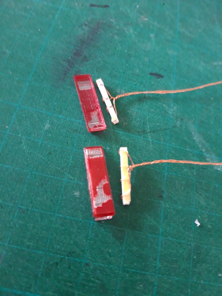 Entsprechend zugeschnitten und mit einem „Lichtkörper“ aus 0,5 mm Kunststoff-Resten versehen, ergaben sich dann „brauchbare Scheinwerfer“ …