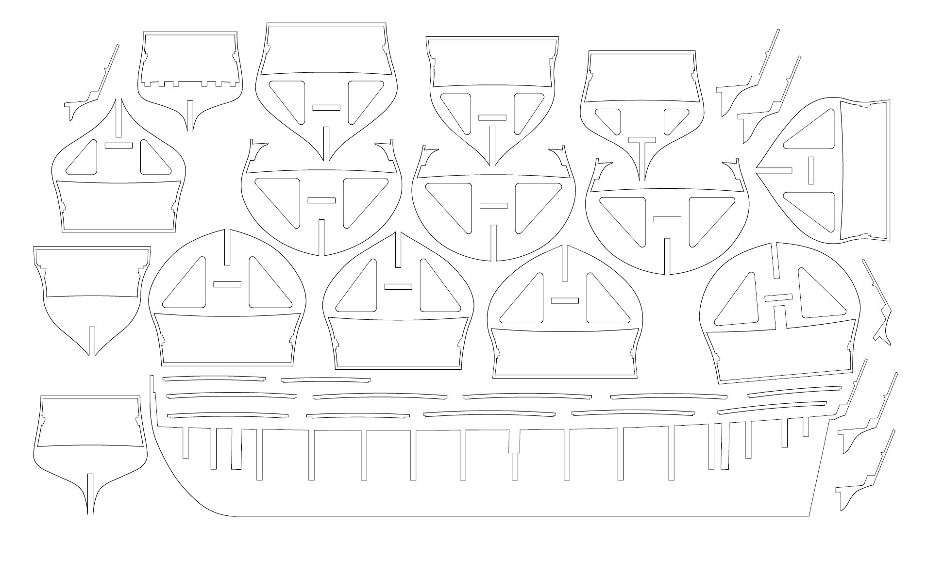 Marquardt hat auf seiner Zeichnung vom Upper Deck allerdings bereits die Konstruktion vorbereitet. Statt der bei dir 7 ehemals vorhandenen nur die 6 für die Konstruktion notwendigen Hölzer (deren Name mir partout nicht einfallen will), welche die Abteile für die Fenster und die auskragende Form des Hecks vorgeben. Es fehlen dann nur noch die Seitenhölzer die sich durch die Form des Rumpfes am Heck ergeben.