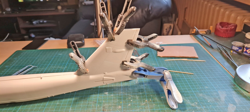 Nun konnte von Leitwerk aus geklebt werden und damit es auch zusammen bleibt, kamen noch ein paar Klammern dazu.