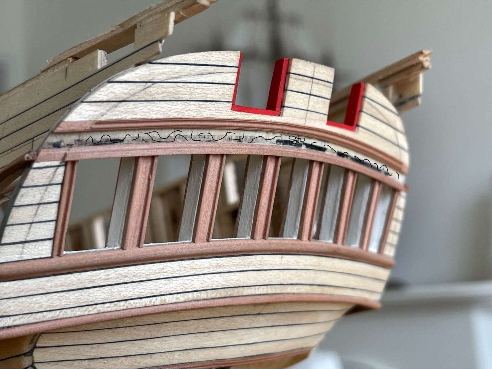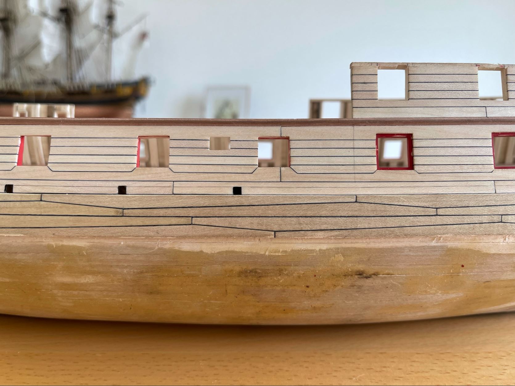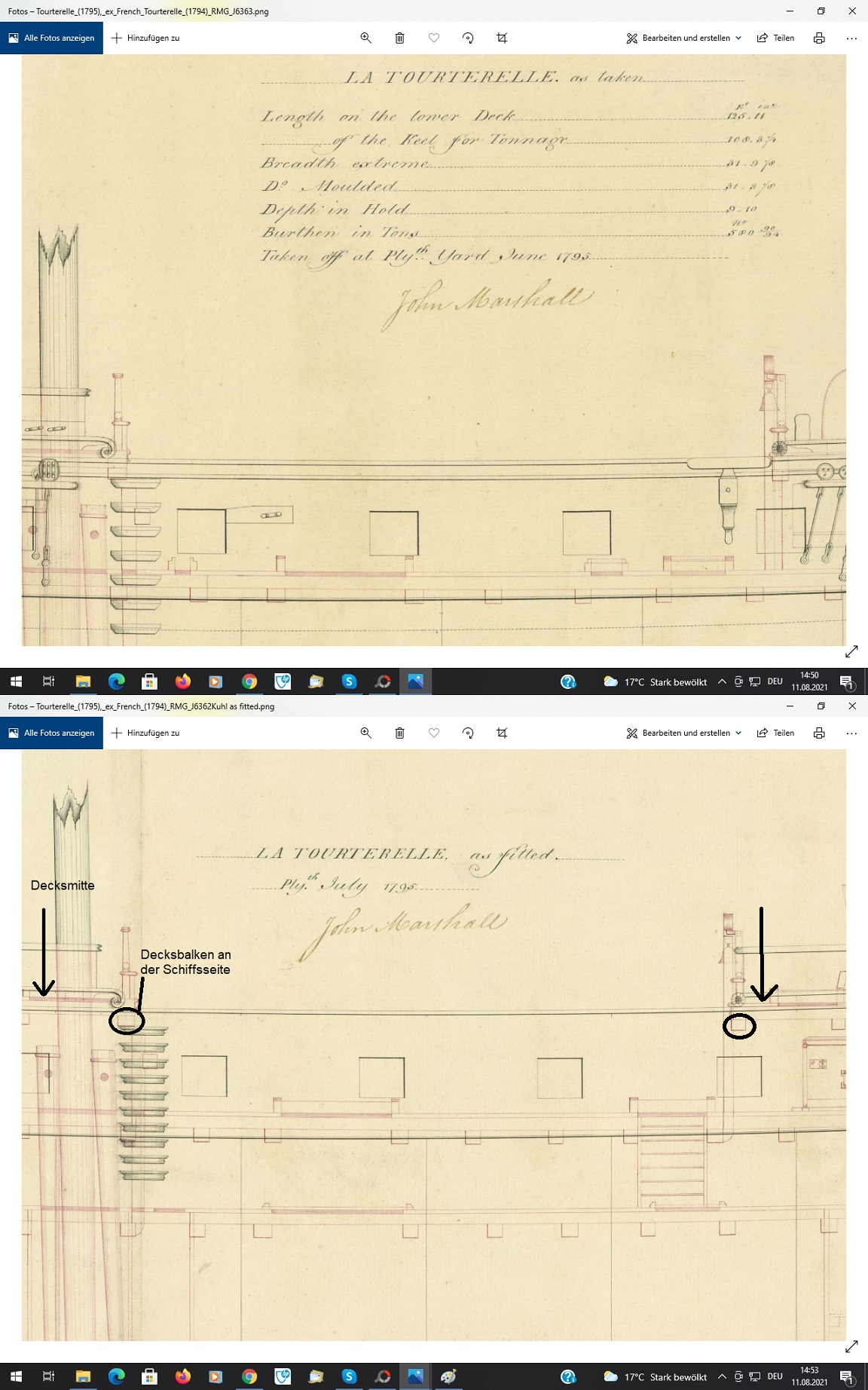 Aber ich meine, wenn man im Achterdeckbereich den Decksbalken folgt, liegt deren Oberkante in etwa auf höhe der oberen beiden Öffnungen der Jungfern, richtig? .. und die wiederum fluchten recht gut mit der zweiten Linie von Oben im Kuhlbereich. Diese Linie (die zweite von oben) läuft auch durch bis zum Bug und fluchtet auch am vorderen Mast mit den zwei Öffnungen in den dortigen Jungfern.