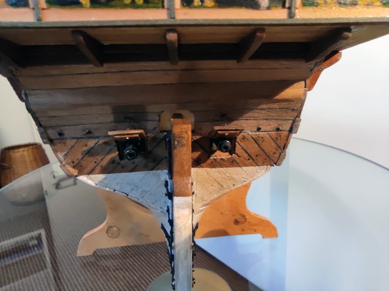 Steuerruder, Drempelrahmen, hintere Jagdgeschütze, Stückpfortenklappen angefertigt, angepasst und eingebaut. Damit sind die Arbeiten am Heck vorerst abgeschlossen. Es geht weiter mit der Galion.