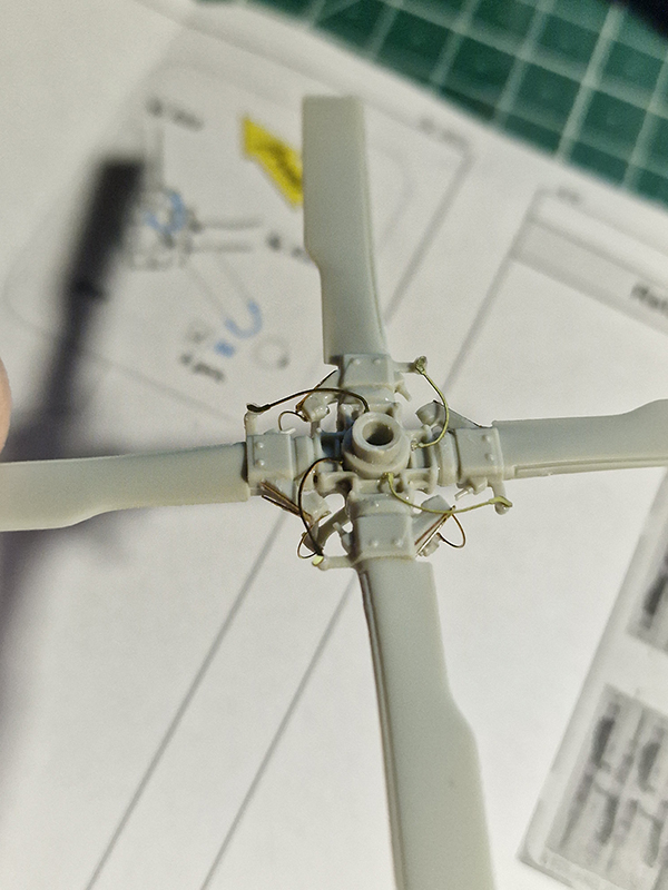 Dazu gehören natürlich noch die Rotorblätter. Zuerst mussten jeweils zwei winzige und dünne Teile angebracht werden.