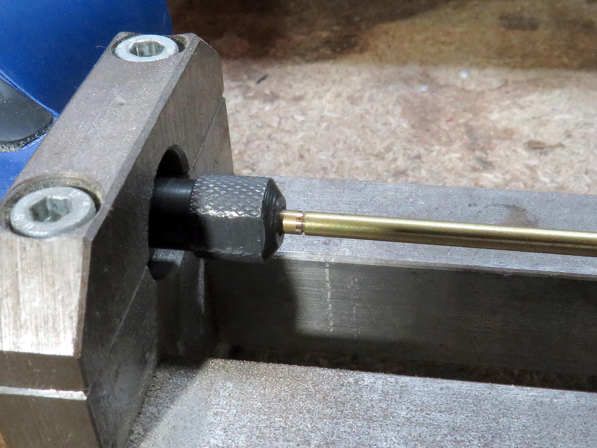 . Zum Glück hatte ich noch Messingrohr mit dem passenden 3 mm Außendurchmesser und 2 mm Innendurchmesser rumliegen. Also fluchs einen 2 mm Zapfen ans hintere Ende des Halbrohres gedreht...