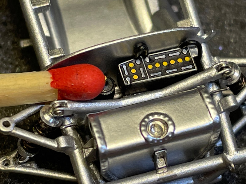 Viel Geduld erforderte der Zusammenbau des Armaturenbretts. Damit ich die einzelnen Instrumente später miteinander verkabeln kann, wurden zuerst o,4er-Bohrungen in den Gehäusen angebracht. Diese wurden dann schwarz gespritzt, mit mikrokleinen Ziffernblätter versehen und in das Armaturenbrett eingesetzt. Das kleinste war das Zündschloss. Es wurde von hinten eingeschoben und dann verklebt. Das hört sich einfach an, war aber eine riesen Fummelei, da es nicht in den fertigen rückwärtigen Rahmen passen wollte und aufwändig nachgearbeitet werden musste. Erst nach dem Einbau wurde es dann mit dem noch kleinerem aller Abziehbilder versehen.