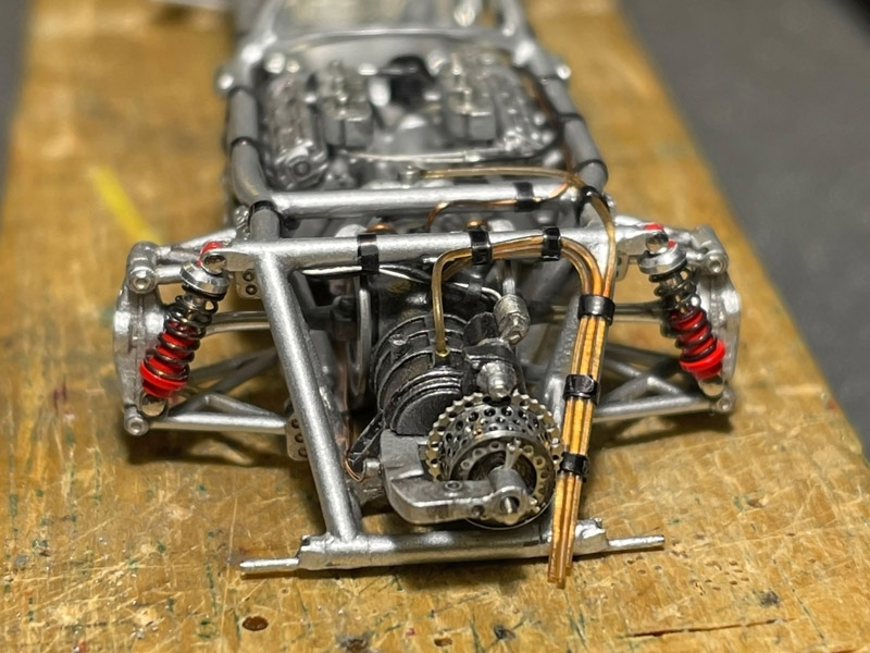 Den Motor habe ich ohne Grundierung hauchdünn mit ALCLAD 105 gespritzt. Für das Getriebe gab es noch etwas Auspuff-Metall von Modell-Master. Nachdem alles gut durchgetrocknet war, wurde noch dezent mit etwas Washing von Tamiya akzentuiert.