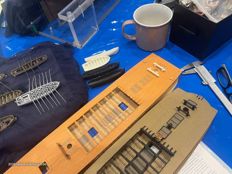 Ich beobachte immer wieder, dass dünne Druckteile wie Ruder und Masten sich nach dem Bemalen verziehen. Siehe obere Bildhälfte.