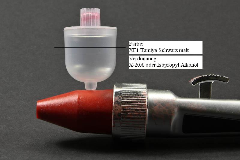 ich habe diese Gun gewählt da ich einen Abrieb durch die Micro-Ballons bei der Farbdüse befürchte, und bei Verwendung von Tamiya Acryll oder Revell Aqua Color ist diese unter dem Wasserhahn sehr schnell gesäubert.