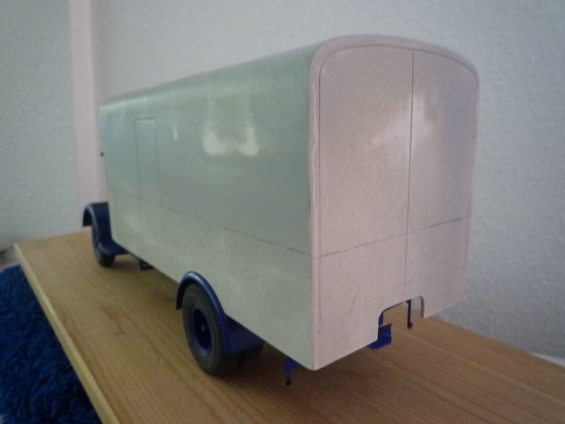 Beim Auflieger konnte ich nur auf Bilder in diversen Büchern und bekannten Altlaster-Zeitungen zurückgreifen. Fasst immer werden dort nur die LKW's beschrieben, seltener die Aufbauten und Hänger. Dann dort die Abmessungen abnehmen (incl.Zugmaschine!) und eine Zeichnung anfertigen. Wozu auch die Zugmaschine? Wegen dem Abgleich der Abmessungen auf dem Bild mit den Angaben auf den Masszeichnungen. Dadurch hat man dann auch mehr oder weniger genau die Abmessungen des Aufliegers. Dann noch an die Revell Bordwände anpassen und der Aufbau ist damit schon fasst fertig. Den Rahmen hab ich aus Profilen selbst angefertigt. Die Achsen sind wieder aus dem Bausatz an abgeänderten Federpaketen und Aufhängung, ebenso wurde der Heckabschluss mit den Leuchten von Revell übernommen.