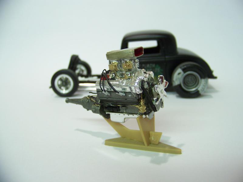 Als Vortrieb dient ein Motor auf Basis eines DeSoto aus dem 49er Mercury, gespickt mit Zutaten einer Ansaugbrücke eines 67er GTX, Vergaserbatterie (aus "Reihendreier" mach "zwei Doppelpack") aus dem 58er Impala und als Häubchen ein aufgedremeltes Scoop des 65er ElCamino. Ausgeatmet wird durch einen abgeänderten Krümmer des 55er BelAir Nomad. Gasgestänge und Spritleitungen fürs Leben, Geschaltet wird mit einem selbstgemachten Schalthebel.