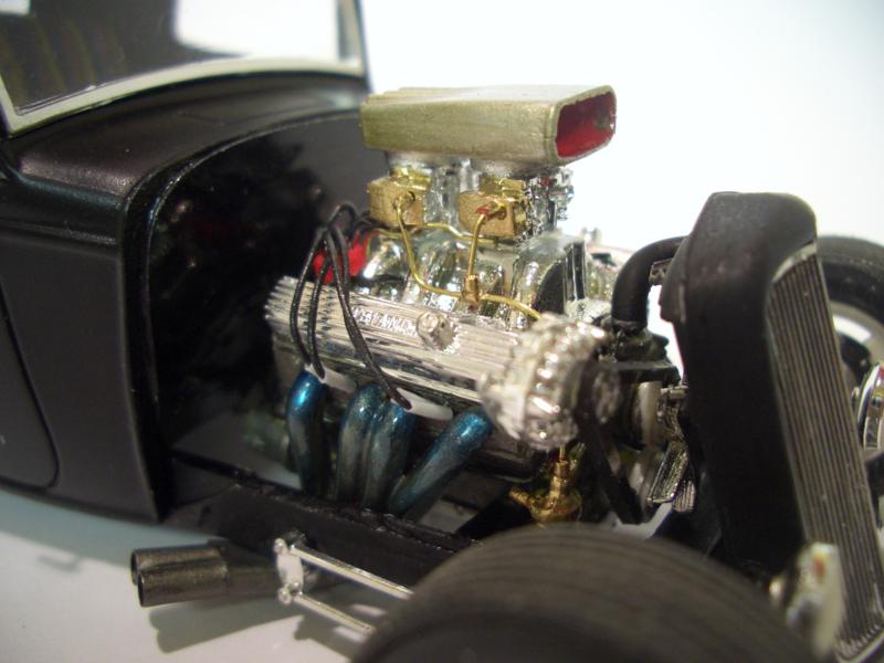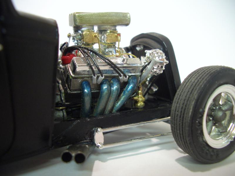 Die Karosserie wurde um die Rahmenhöhe tiefergesetzt, Hinterachse selbstgebaut und die Vordere ein Stück weiter vorne gekippt angesetzt. um mehr Bodennähe zu bekommen. Kühler schräg gestellt und tiefer am neuen Querrahmen montiert. Zum Lenken ein Lenkgetriebe aus dem 60er Impala (?), selbstgebaute Spurstangen / Achsschenkel und Lenkstange. Motorrückwand gerade gezogen und Glanzlackiert, der Rest der Karo wieder matt.
