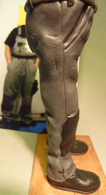 Dann kann modelliert werden. An den Füßen beginne ich. Die Schuhe und anschließend die Hose, alles nach Fotovorlage. Sobald dies fertig ist, stelle ich die Figur für eine Stunde in den Backofen.