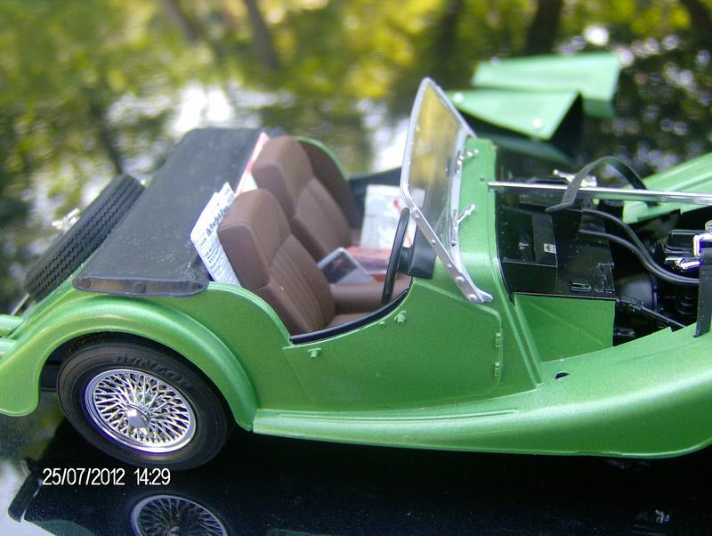 heute möchte ich euch endlich mal wieder etwas zeigen von mir. Wie viele wissen, habe ich einen England-Tick (auch grade passend zu der Olympia-Eröffnung in London), genau deswegen habe ich den Morgan bereits gebaut gekauft. Auch wenn ich zu großen Teilen nichts an dem Morgan verändert habe, möchte ich ihn euch trotzdem vorstellen. Den Lack habe ich so gelassen, mir gefällt die Farbe, und da kann ich drüber hinwegsehen, dass sie trotz Politur nicht besonders glänzt. Ist halt ein alter Engländer. Die einzigen Überarbeitungen an dem Morgan bezogen sich auf die Reparaturen der Achsen und auf die Überarbeitung des Innenraums.