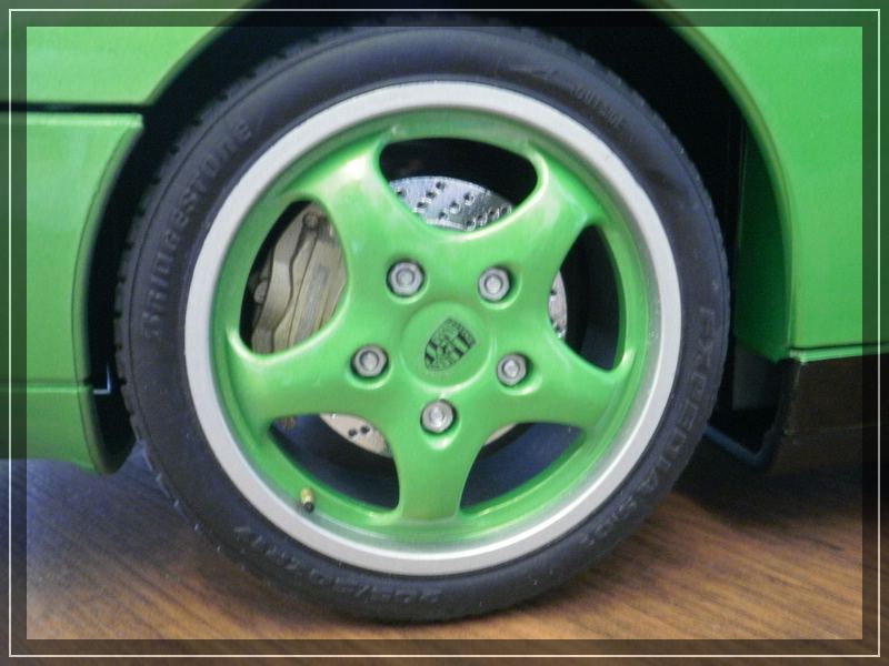Um zu sehen wie die Felgen später am fertigen Modell aussehen habe ich die Karosse mal aufgebockt und die Felgen drunter gestellt.