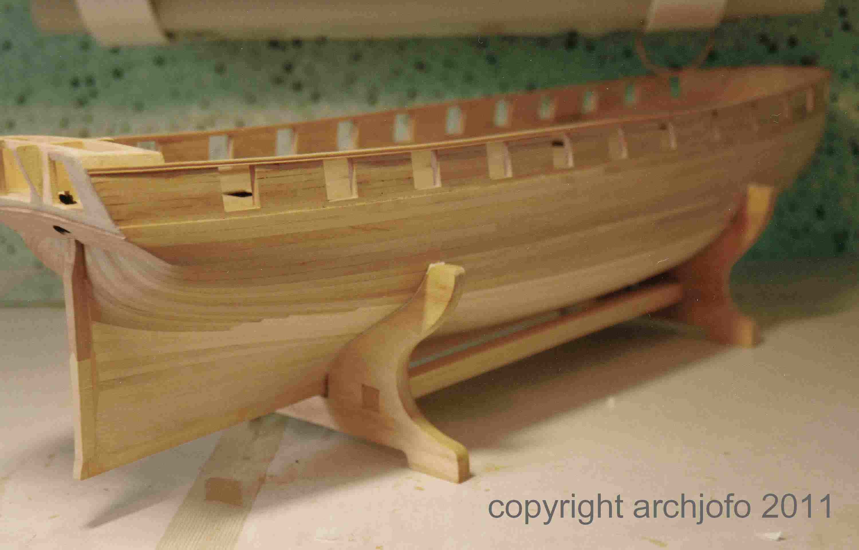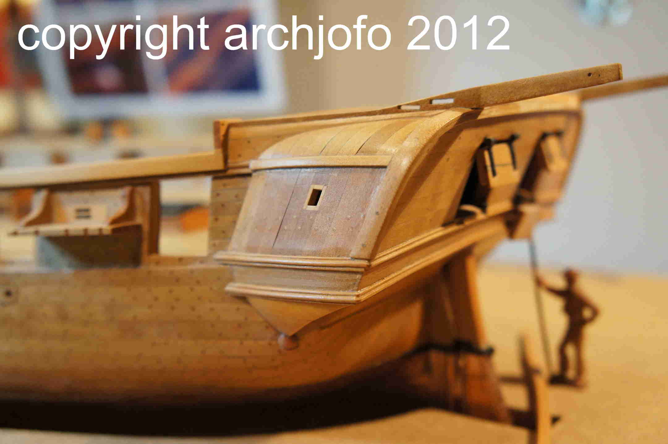 Die Befestigung der Beschläge für die Belichtungs- und Belüftungspforten (keine Riemenpforten, wie ursprünglich angenommen), die das Unterdeck mit spärlichem Licht versorgen und beim Öffnen eine geringe Querlüftung ermöglichen, erfolgt mit kleinen Bolzen. Diese haben einen Schaft mit 0,3 mm Durchmesser, wobei der Kopfdurchmesser der Bolzen bzw. Nieten 0,5mm beträgt. Dazu müssen noch 8 Bohrungen mit einem Durchmesser von 0,3 mm in diese Beschläge gebohrt werden. Das ist eine sehr diffizile Angelegenheit, da die Materialbreiten der Beschläge unter einem Millimeter liegen.