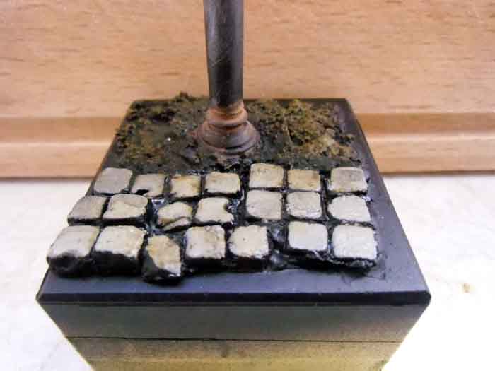 Katja, JETZT hab ich Angst... Der Sockel wurde schon mal schwarz grundiert, ebenso die Figuren (AutoK Spraila, die beste schwarze Grundierung für Figuren wo gibt). Schwarz habe ich deswegen als Grundierung genommen, weil ich die Bemalung etwas comichafter machen möchte, um den surrealen Charakter etwas zu unterstreichen. So bekommt man am Besten deutliche Abgrenzungen hin. Vor allem bei den Pflastersteinen sieht man das sehr deutlich. Diese wurden mit Medium Sea Grey (Tamiya) bemalt, der Boden im "Hintergrund" wurde mit "Rhinox Hide" und "Snakebite Leather" (Dunkelbraun und Mittelbraun) von Games Workshop mit einem Stückchen Schwamm getupft. Total easy, aber liefert gute Ergebnisse. Ausserdem saue ich mir so weniger Pinsel ein. Anschliessend noch etwas Sepia-Tusche von Vallejo drüber und fertig. Vorerst... Die Laterne wurde ebenfalls per Tupf-Technik gealtert. Nur eben mit einem Mix aus Gun Metal und Stainless Steel (beide Testors). Vielleicht gehe ich noch mit etwas brauner Pastellkreide drüber, um Rostflecken anzudeuten, mal sehen...