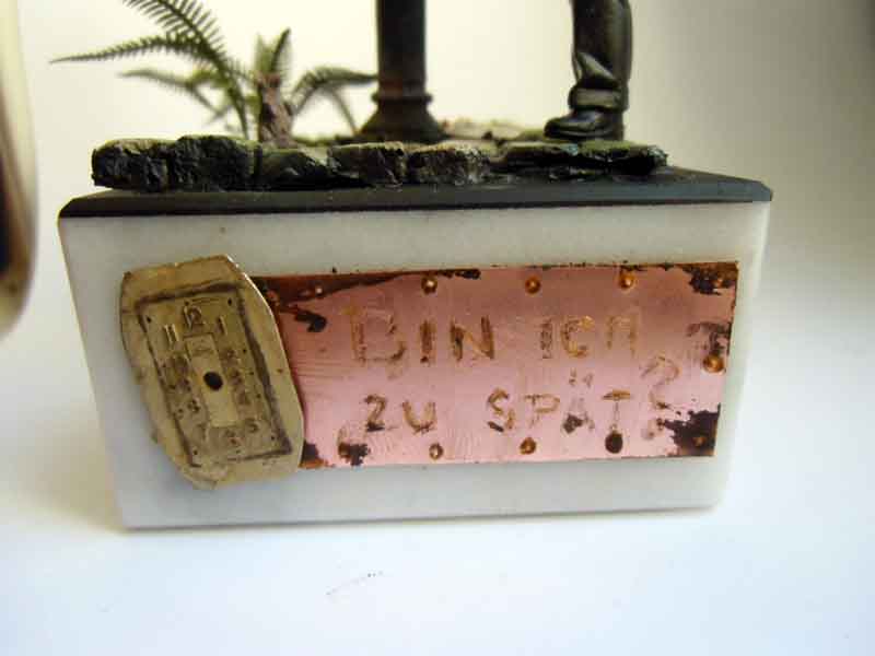 Wunderbares Fotowetter heute ;) Die Plakette ist kompleeter Eigenbau aus einem Stück Kupferblech. Braunes Washing drüber, abrubbeln... ergibt super Rosteffekte. Die Schrift wurde eingekratzt, ähnlich wie bei einer Radierung. Da ich gelegentlich selber welche fertige, habe ich also noch genügend Edelstahlplatten und Kupferblech hier. Nur ist bei der Plakette der Effekt genau umgekehrt. Damit man es lesen kann, ist die Schrift hier positiv, bei einer Radierung arbeitet man genau andersrum, da ja von der Platte gedruckt wird (also ist dmentsprechend die Schrift auch spiegelverkehrt anzufertigen). Die Nieten wurden von hinten mit einem Bleistift durchgedrück, die kleine Armbanduhr aus meiner "Steampunk-Kiste", ohne Zeiger versteht sich, greift das Thema noch mal auf... Wie gesagt... die Details. Genug gequatscht, hier sind die Bilder. die nächsten dürfte es dann in der Galerie geben.