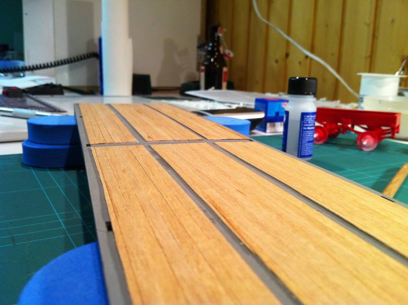 Als nächstes sollte der Trailer seine Ladefläche bekommen. Auch hier wieder viel schleifen, spachteln und abkleben. Abkleber daher, da ich die geprägte Holzoptik nicht wirklich toll finde. Ich wollte die Ladefläche ein bisschen "realer" aussehen lassen. Also musste echtes Holz her.