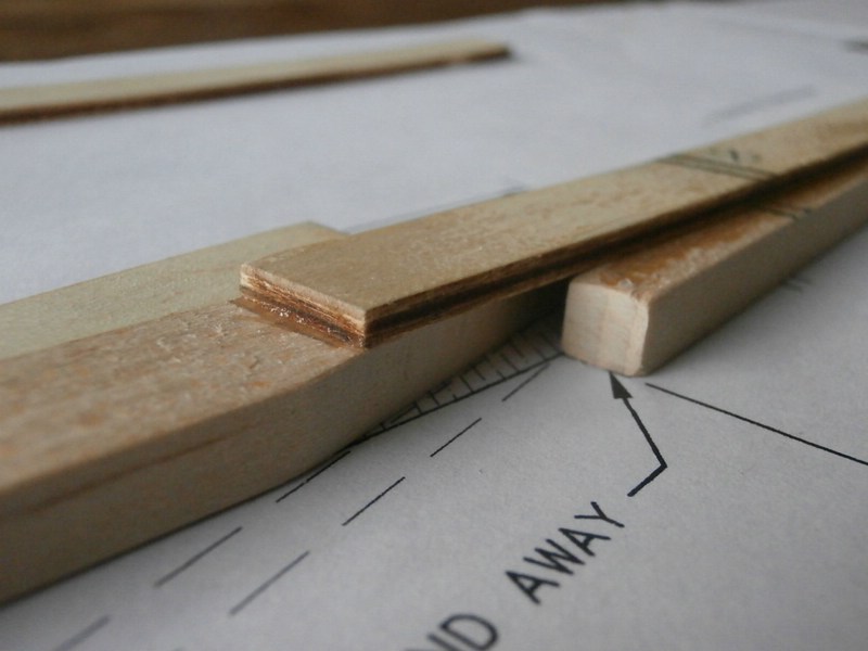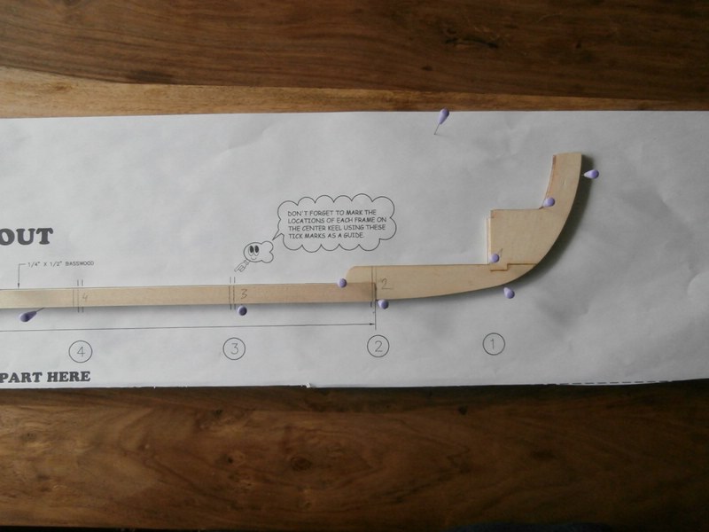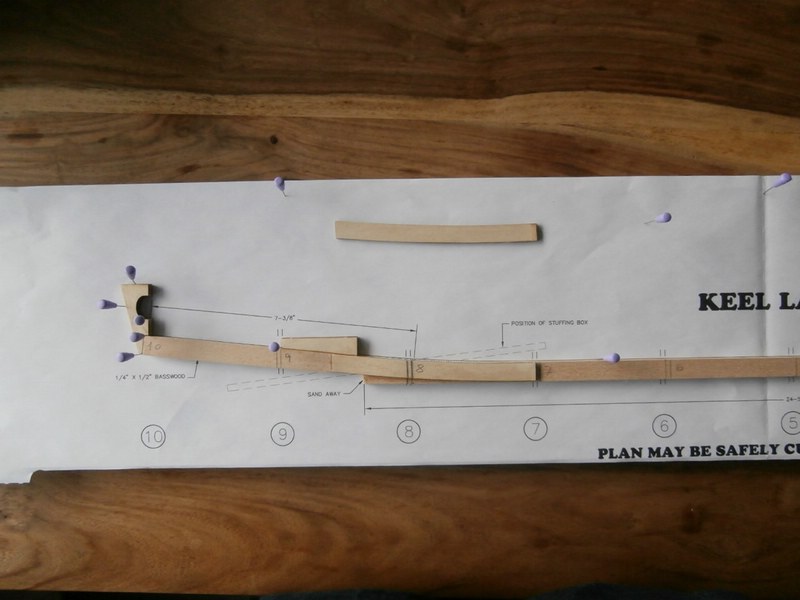 Heute habe ich die Kiellegung vorgenommen . Auf dem 1zu1 Bauplan ist die Vorlage dazu vorhanden , wirklich sehr gut gemacht . Passt soweit wie angegossen . Nur die Kielleiste ist 1mm breiter wie die gelaserten Teile , aber das kann man sich hinschleifen . Verklebt habe ich die Kielleiste mit den Lasercut Teilen mit Ponal Turbokleber . Die Lasercutteile habe ich mit normalen wasserfesten Ponal zusammengefügt , da sie immer aus zwei Teilen bestehen . Schön zu erkennen ist auch die bereits bei der Kiellegung vorhandene Öffnung für das Stefenrohr . Ein späteres aufbohren wird somit überflüssig .