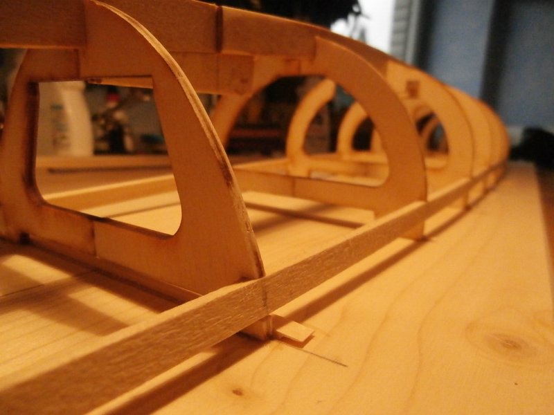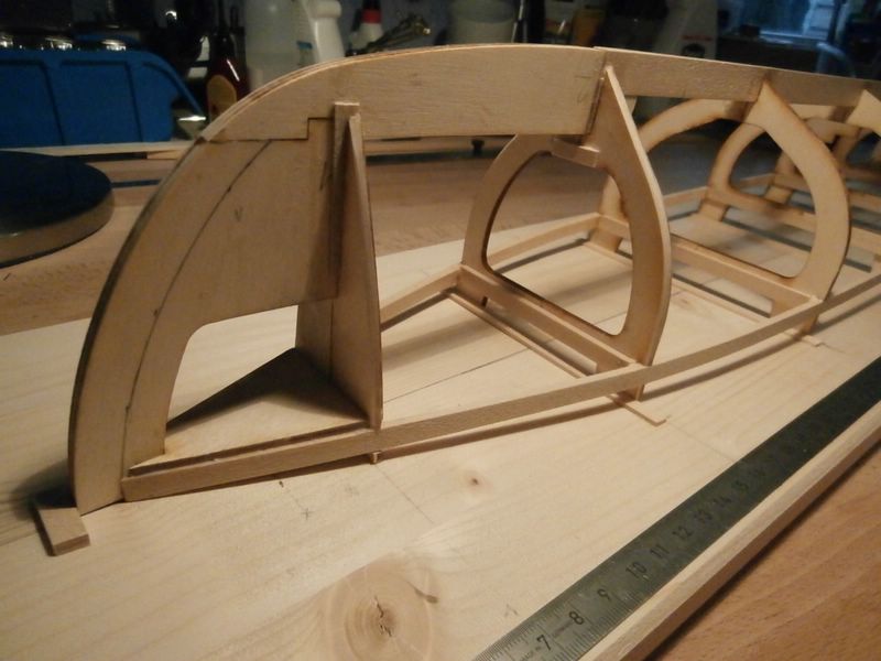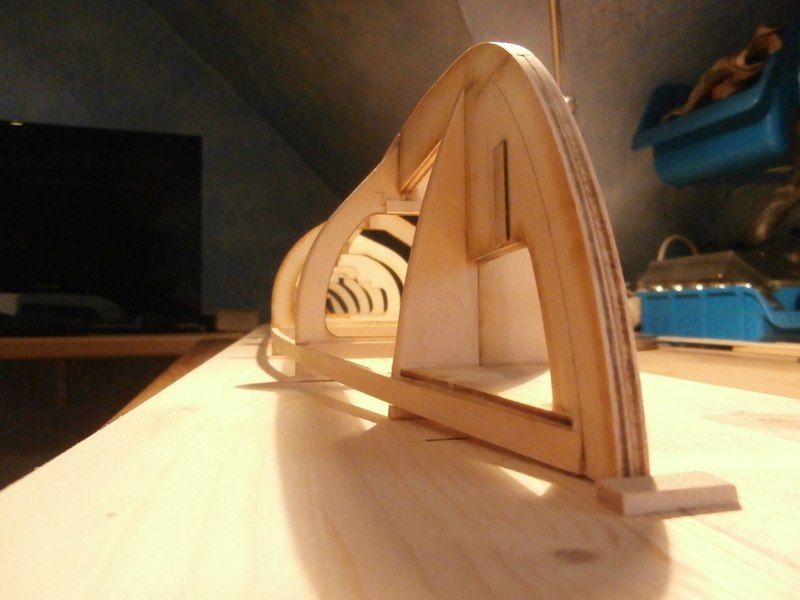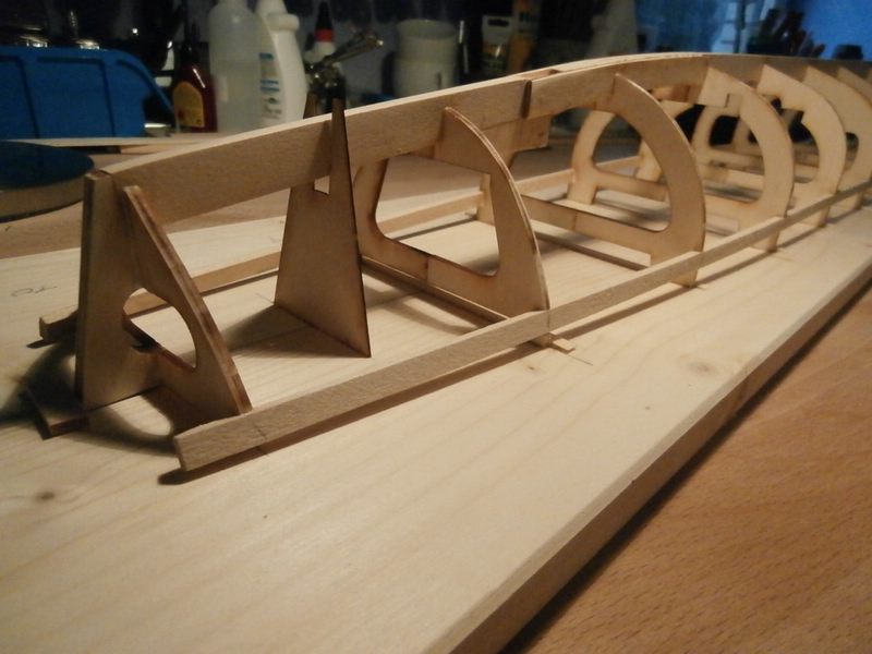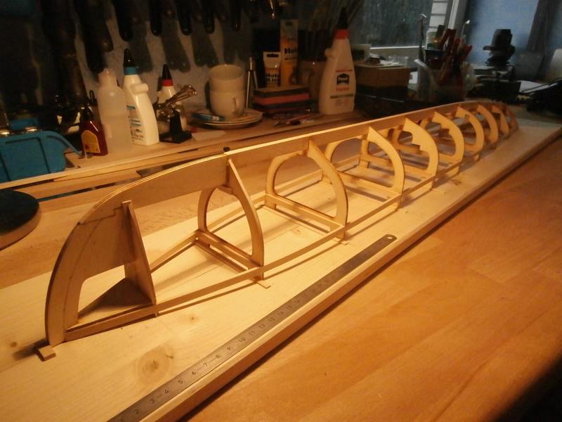 habe nun das Spantengerüst fertiggestellt . Die einzelnen Spanten wurden in einem leichten Winkel auf der Bodenplatte mit Kleber fixiert und mit dem Kiel verklebt . Die beiden Leisten der Deckskante habe ich mit dem Leistenbieger noch in Form gebogen , da sie mir doch im Orginalzustand einwenig zu sehr auf Spannung waren . Zum verkleben habe ich Ponal Turbokleber , sowie Ponal Leim Wasserfest benutzt . Die Teile passen bis hierher sehr gut zusammen . Nacharbeiten musste ich nur bei den Aufnahmen für die Decksleisten machen . So , nun lasse ich das ganze einwenig aushärten , damit ich dann mit der Beplankung des Rumpfes mit Balsa Leisten fortfahren kann . Ich hatte mir auserdem gedacht , das Boot doppelt zu beplanken , da auf vielen Orginal Fotos doch die einzelnen Planken zu erkennen sind . Überlegt habe ich , die Kalfaterung dann mit Holzkit zu machen , den ich dann ein weing "eindrücke" . Aber mal schauen wie das Probestück wird .