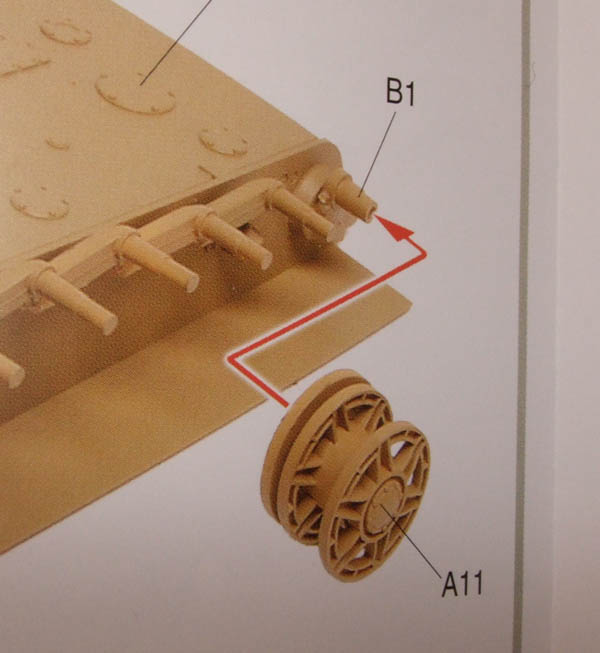 Genau so wird es auch richtig an Panzermodellen gemacht. Triebräder, Laufrollen und Spannrollen werden lose ohne Kleber aufgesteckt. Die Kette wird zusammen gesetzt (wenig Klebstoff) und an das Laufwerk angepasst. Üblicherweise baut man die Kette pro Fahrzeugseite in zwei große Segmente. Man läßt sie über dem Triebrad und dem Spannrad offen - also dort die Ketten nur mit Klebeband verbinden, nicht kleben. So kann man sie leicht wieder abnehmen, um sie separat zu lackieren (wie auch die Laufrollen).Leider gibt es keine Aussparrung an der Wanne sowie am Schwingarm.