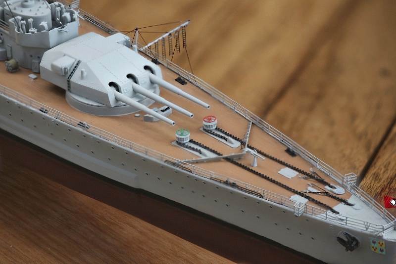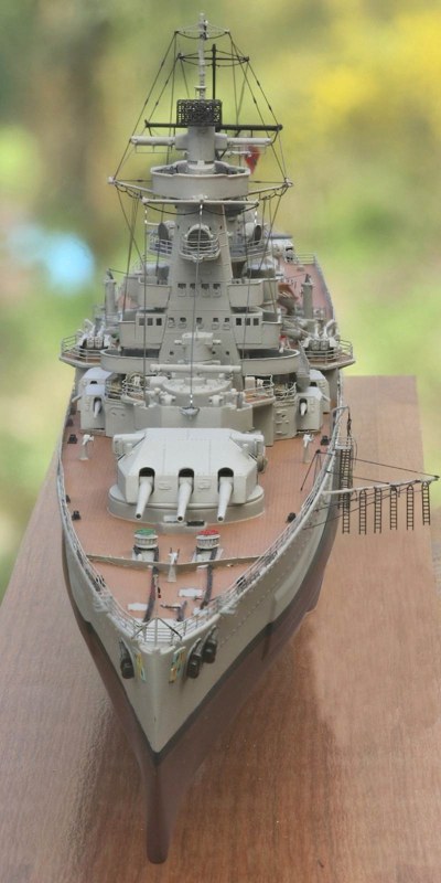 Ich möchte Euch hier mein Modell der Admiral Graf Spee vorstellen, dass ich schon vor einigen Jahren gebaut habe. Zur Verwendung kamen dabei der Bausatz von Trumpeter, gedrehte Rohre für die Hauptartillerie aus Aluminium und ein Ätzteilesatz von Eduard. Daneben fanden noch eine ganze Reihe Teile aus der Grabbelkiste, wie Ankerketten, Drähte, hauchdünne Bleche etc. den Weg ins Modell. Lackiert habe ich alles mit Enamelfarben von Model Master.