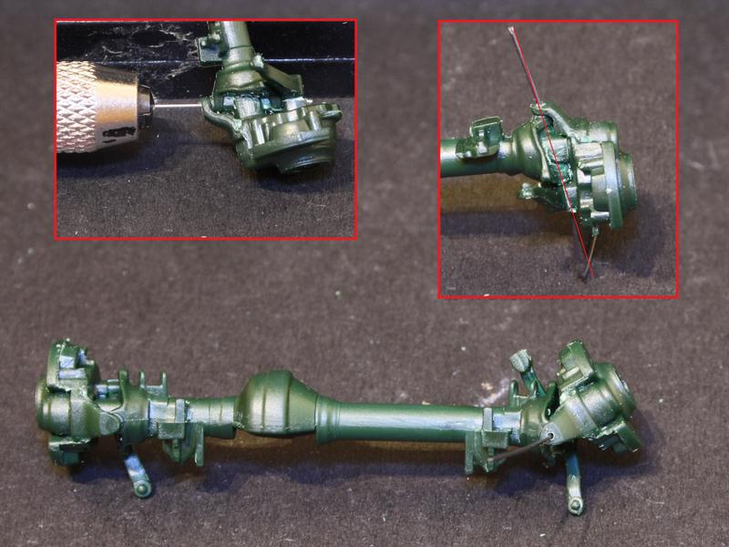 Daher habe ich die Bremsscheiben mit den Achsschenkeln verklebt, auf die Achse gesteckt und mit einem 0,5mm Bohrer durchbohrt.