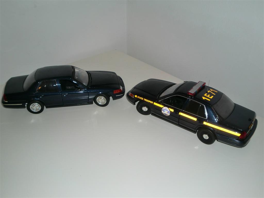 Diesmal habe ich als Basismodell ein Fahrzeug von Motormax verwendet. Von diesem Hersteller ist das Modell nicht so gut ausgearbeitet wie von Auto Art. Allerdings gab mir das auch die Gelegenheit zu versuchen das Modell, neben dem eigentlichen Umbau, auch entsprechend aufzuwerten bzw. besser aussehen zu lassen. Deshalb habe ich auch noch ein paar Vergleichsbilder mit dem Basismodell mit angehängt. Das Fahrzeug stellt ein State Trooper Fahrzeug des Bundesstaates New York dar. Diese Behörde erfüllt eine überregionale Polizeifunktion sowie als Autobahnpolizei auf außerstädtischen Autobahnen (Interstate Highways), soweit mir bekannt ist.