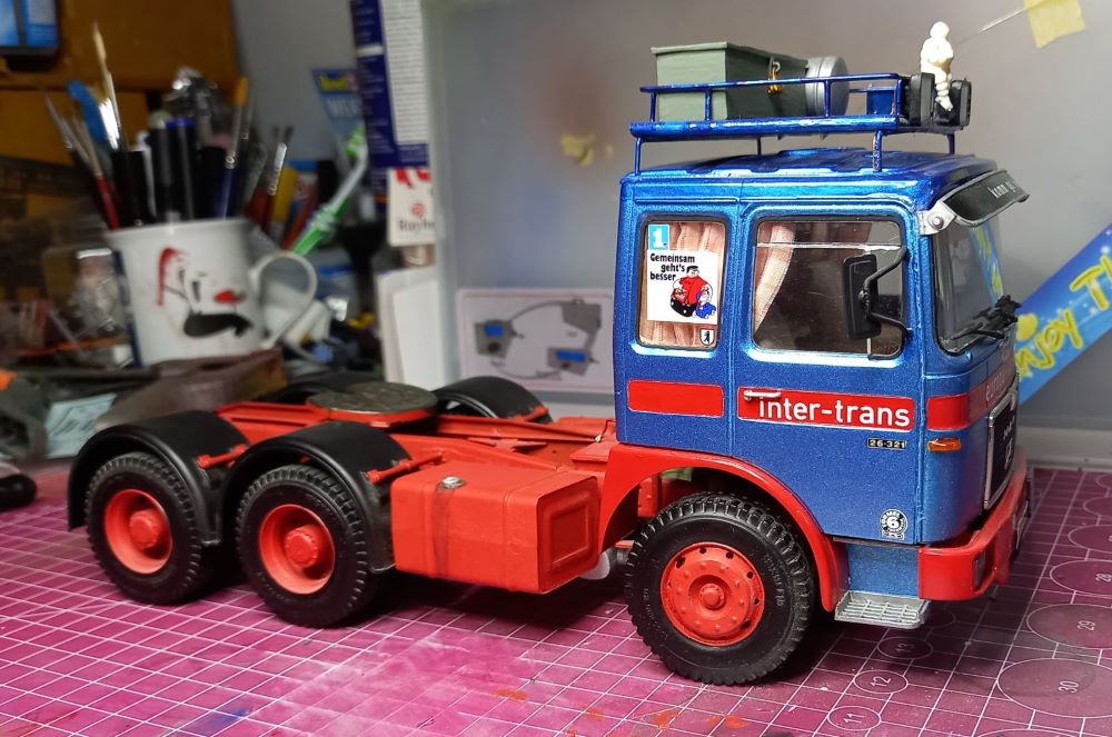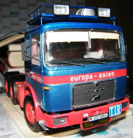 Die Hütte nach der ersten Montage. Um das blau etwas aufzulockern bekam der MAN noch ne rote Bauchbinde in die Vertiefungen, in welche dann die Firmenbeschriftungen Einzug hielten, wie es bei vielen Vorbildern auch der Fall war. Die originale Stoßstange habe ich gekürzt, sprich den Spoiler mit den Neblern abgetrennt, danach habe ich einen Bügel mit zwei Zusatzscheinwerfern (aus den original Neblern) installiert und als Schutz für die Scheinis Streckgitter angebracht. Ursprünglich wollte ich an den Hauptscheinwerfern auch noch Gitter anbringen, weil man dies bei den Originalen auch oft sieht, war mir dann aber too much.