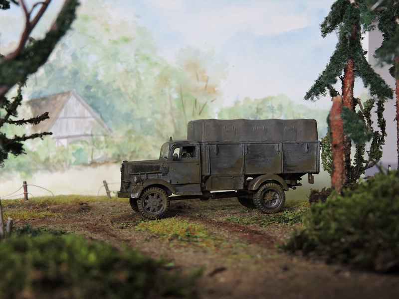 hier einige Bilder diverser deutscher Militärfahrzeuge des zweiten Weltkrieges im Maßstab 1:72. Die Bäume sind selbstgefertigt, der Hintergrund ist ein Aquarell.