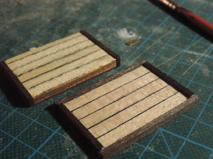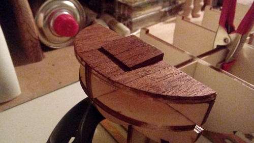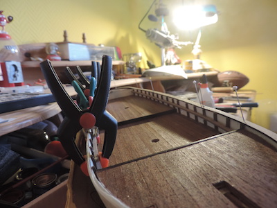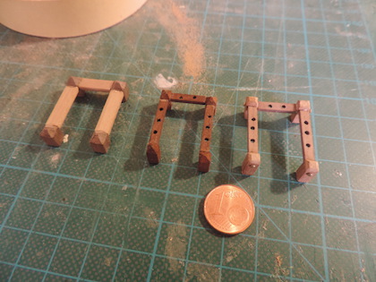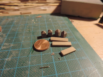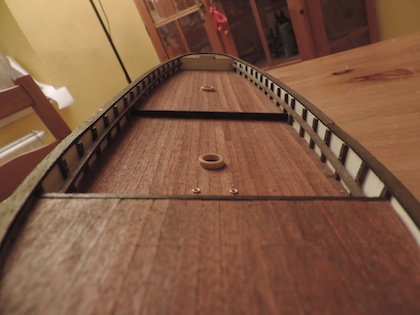 Also also Teile geschliffen, eingepasst und mit 0,5mm Bohrungen versehen. Mit ein paar wenigen Hammerschlägen passten die übriggebliebenen Nägel von der Rumpfbeplankung perfekt in die Bretter.