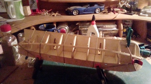 Der Rumpf ist fertig beplankt, Steven und falscher Kiel angebracht und verleimt. An einer Seite sind leider ein paar kleine Dellen entstanden, die ich hoffentlich morgen beim Schleifen etwas verringern kann. ;(