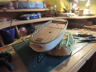 Die verschiedenen Deckteile fertig geplankt, Schanzkleid innen weiß lackiert und Spantenspitzen angebracht.
