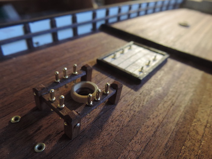 Anschließend habe ich die Nagelbank entsprechend ausgestattet, gebeizt und mit der Luke zusammen mal auf das Deck gestellt.
