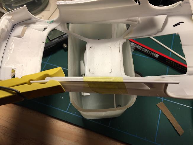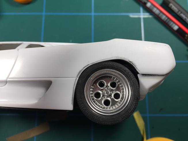 Somit wurde es einerseits erforderlich, die Radkästen weiter auszuschneiden, um die auch im Umfang gewachsene Bereifung unterbringen zu können. Außerdem wurde es notwendig, die Karosserie im Bereich der hinteren Radkästen zu verbreitern. :idee: