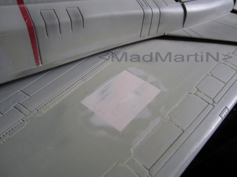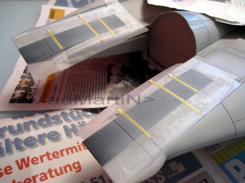 Viele Bereiche mussten auch zugespachtelt werden (vor allem die riesigen JSI-Logos, die unten in die Tragflächen graviert waren) und Schleifarbeiten sind auch einige notwendig....