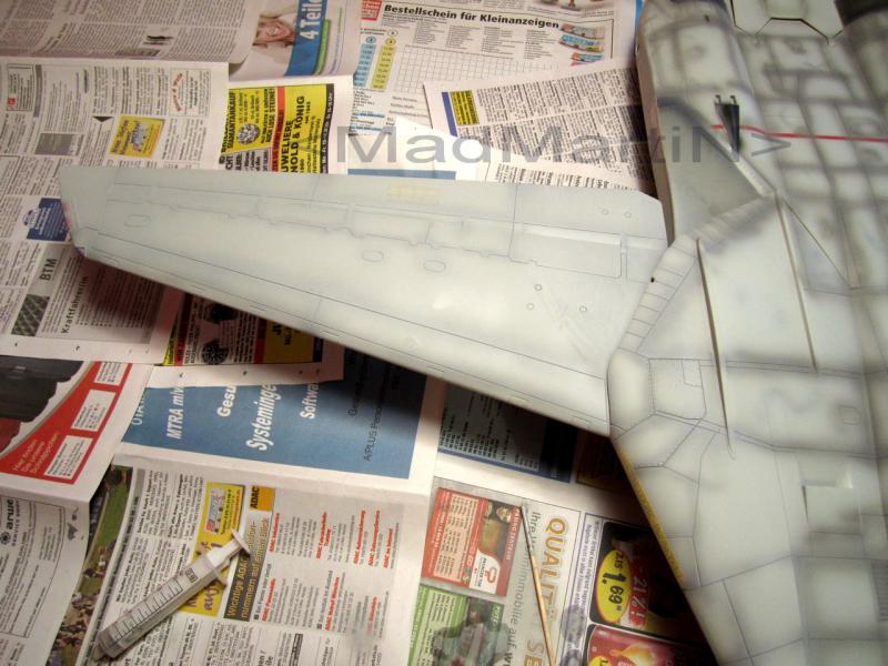 Test-Lackierung der Tragfläche. Die Farbe ist eine Mischung aus Gunze H315 und weiß, um das Grau von JSI exakt zu treffen: