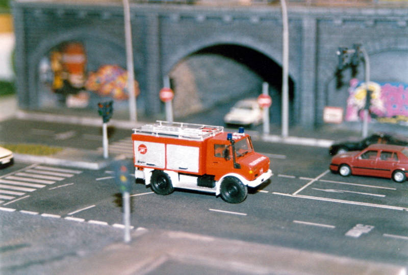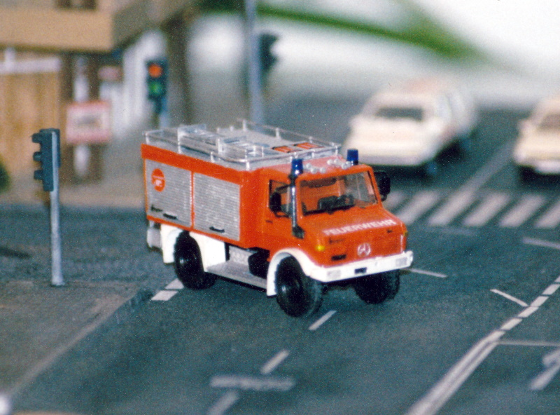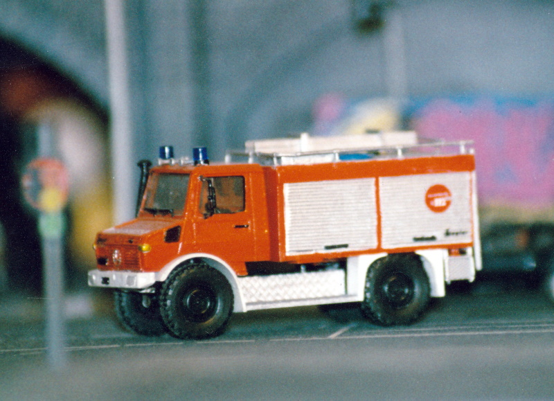 Auch ein TLF auf Unimogbasis darf nicht fehlen, Basis ist ein Unimogfahrgestell von Roco, der Aufbau wieder Scratch: