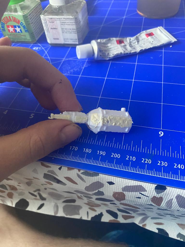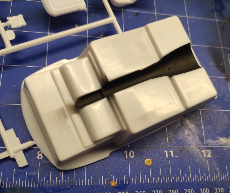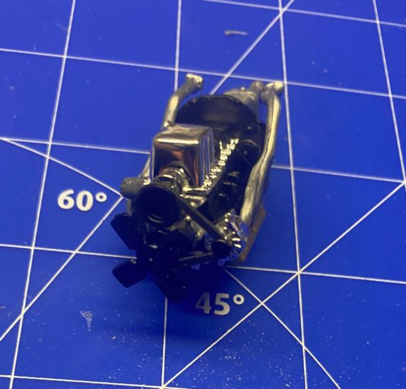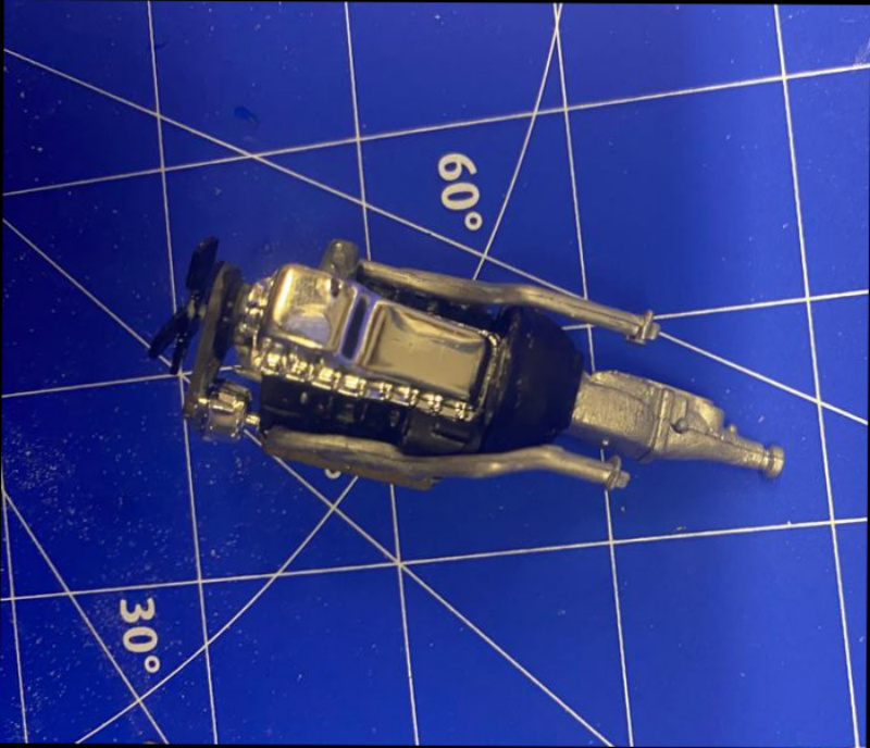 Der Wagen gefiel mir so sehr und wollte ihn deshalb bauen. Los ging es als erstes mit dem Motor. Hier habe ich quasi nach Anleitung zusammengebaut. Die beiden Motor-Hälften zusammengesetzt, gespachtelt, verschliffen und dann anschließend bemalt. Danach kamen noch weitere Motorteile dazu und schon war der Motor fertig.