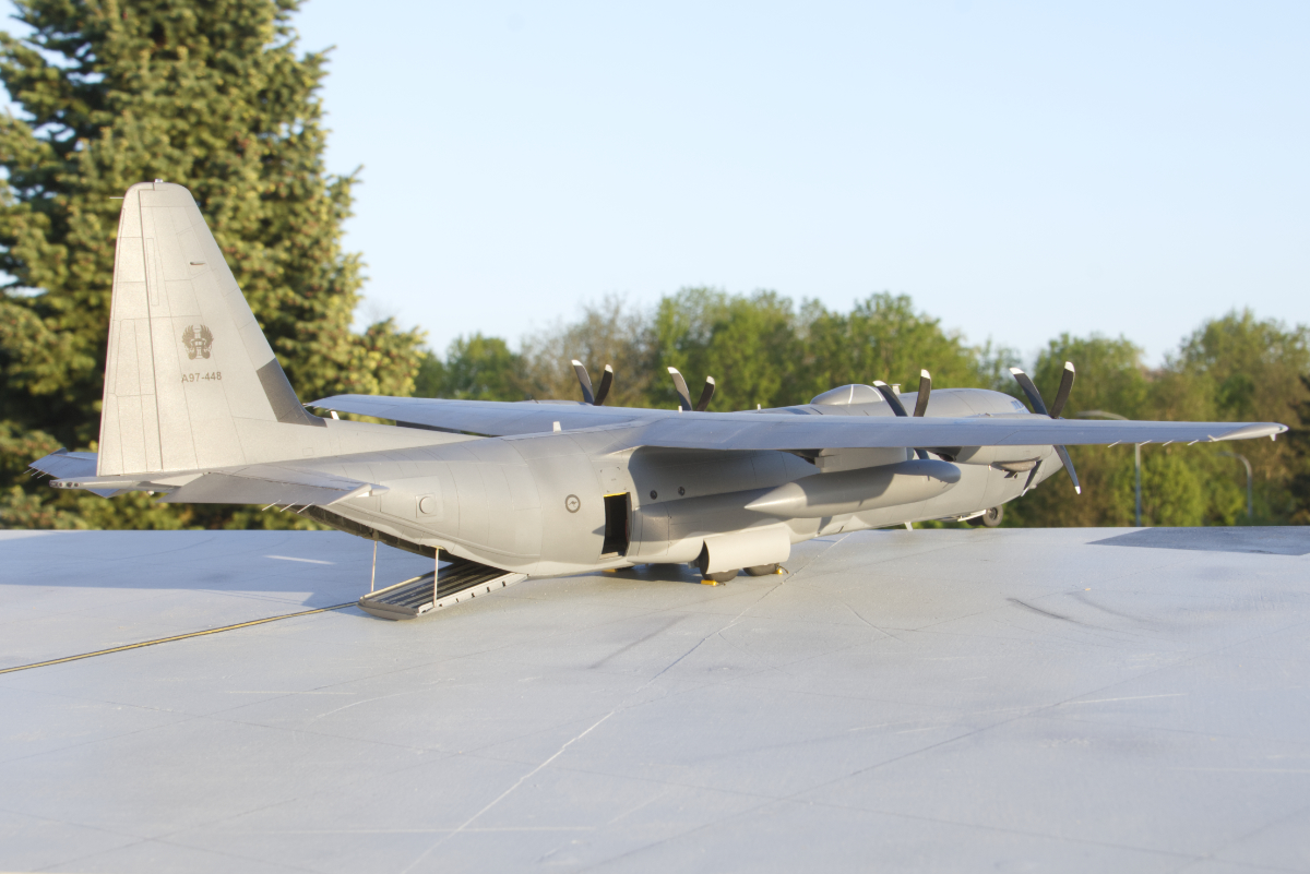 Gebaut wurde der Bausatz von Zvezda mit nur wenig Zubehör, lediglich Räder und der Litening Pod von Eduard Brassin sowie Masken von ResKit kamen zum Einsatz. Darüber hinaus sind aber etliche eigene Verbesserungen eingeflossen, so z.B. die Netze an den Sitzen im Laderraum, die SATCOM-Antenne, der Pylon für den Litening-Pod, zahlreiche Sensoren und Verstärkungen an der Rumpfhülle oder auch das HUD, welches ein Merkmal der modenen Herci-Varianten ist.
