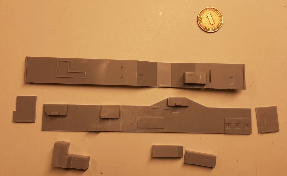 Teile für das Bootsdeck. Das Teil neben dem Pfennig ist das Rolltor für den Hangar, das aber laut Platzverhältnissen, laut Logik und laut Kagero-Heft keine senkrechten, sondern waagerechte Lamellen hat.