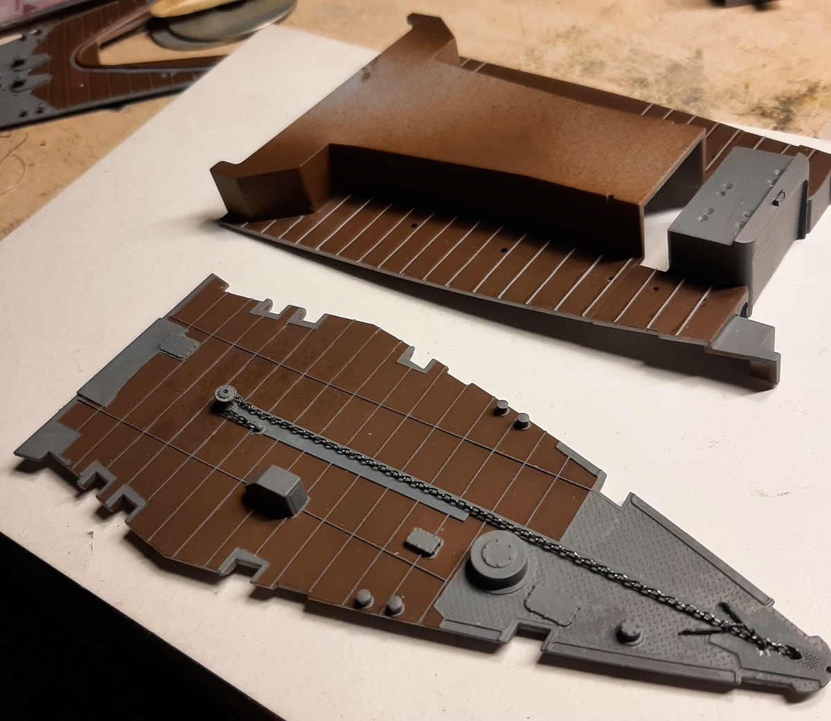 Bevor es an die Rumpfhälften selber geht, werden zuerst einige Deckabschnitte gebaut, die direkt bei oder unmittelbar nach dem Zusammenfügen der Hälften eingesetzt werden. Die werden auch direkt detailiert und lackiert.
