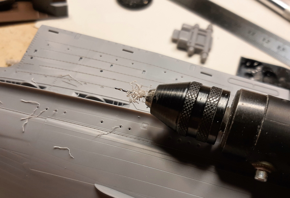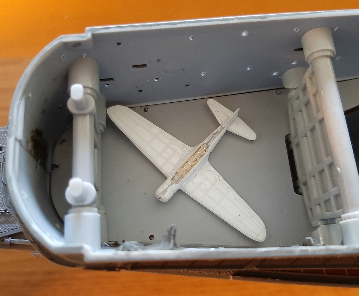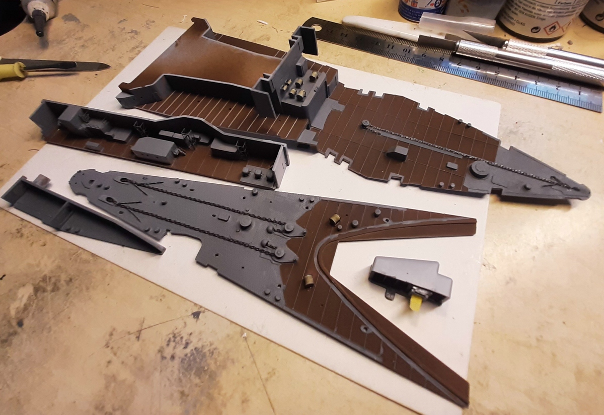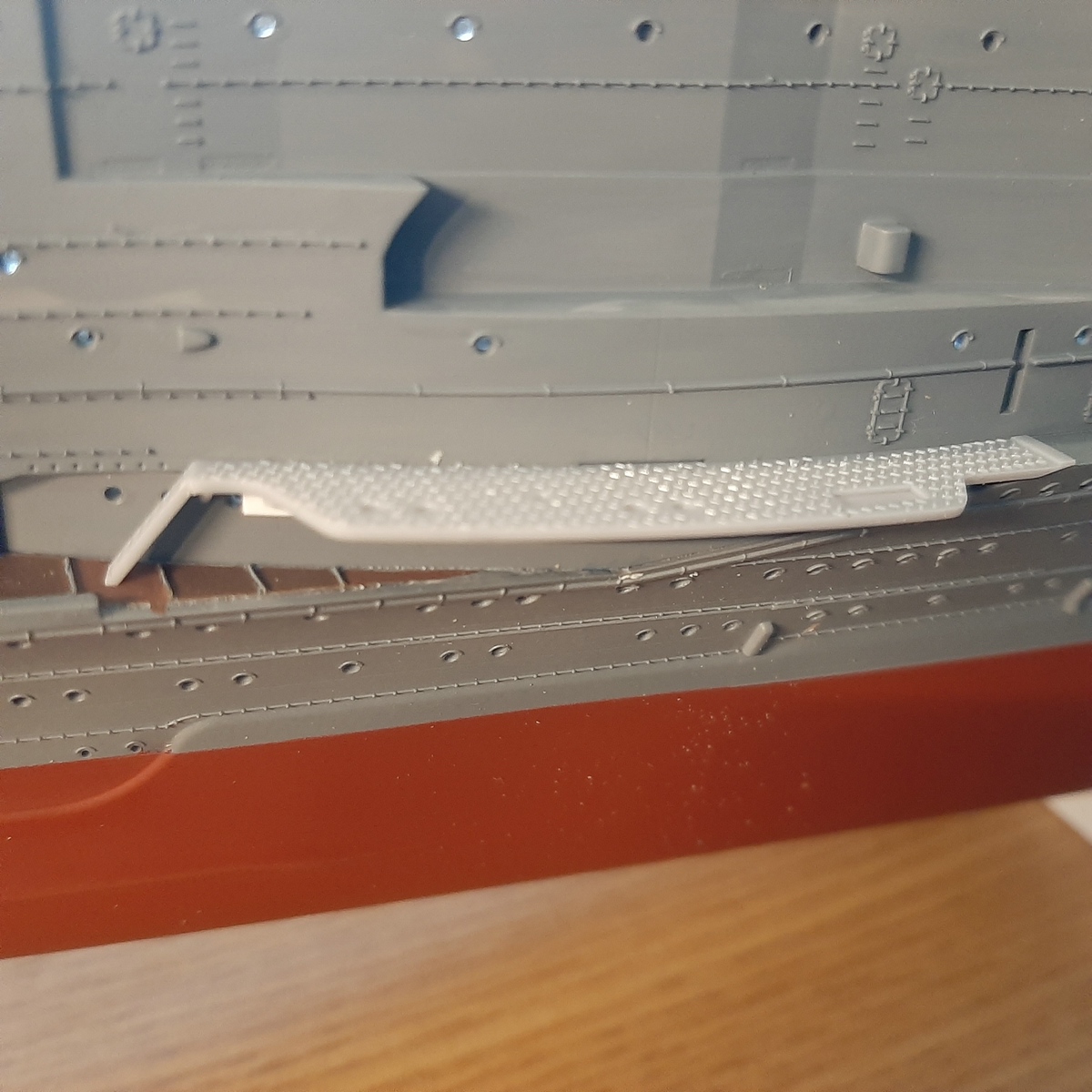 Wollte es nicht neu gravieren, das bekomme ich nicht hinreichend ordentlich hin, also habe ich zwei übriggebliebene Hangartore von der HMS Repulse so genau wie möglich zusammengefügt.