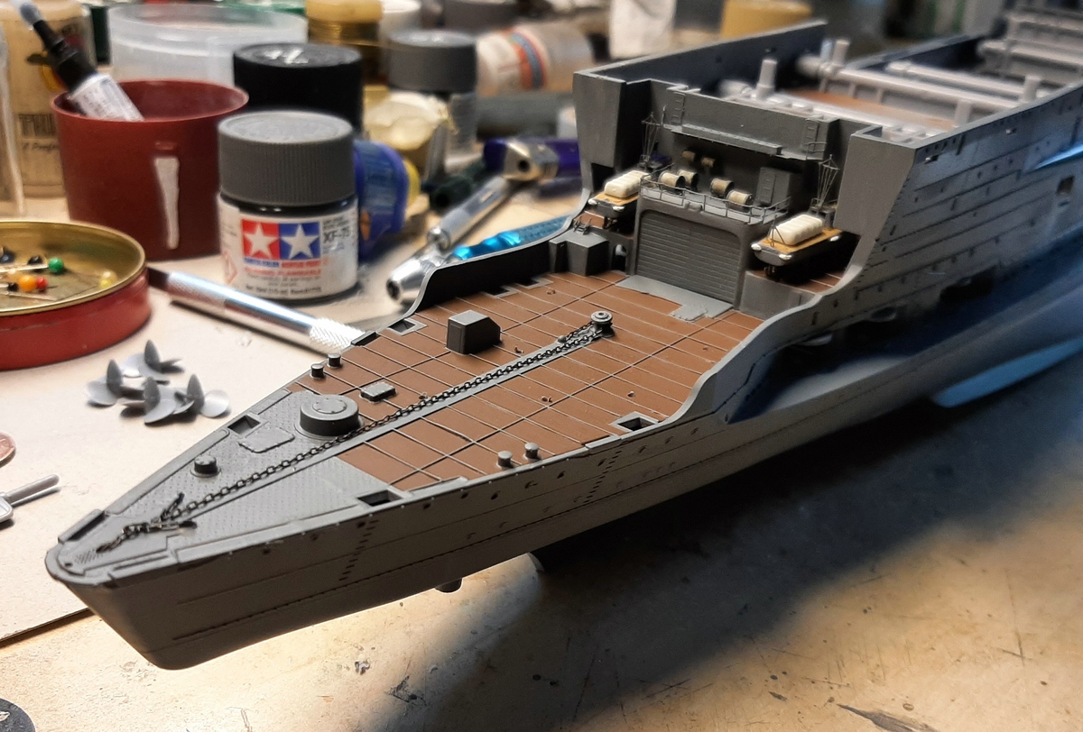 Leider von beiden Herstellern vernachlässigt, gibt es am Rumpf noch ein paar mit Linoleum belegte Flächen. Am innenliegenden Bootsdeck hatte ich die Befestigungsleisten ja mit Klebebandstreifen imitiert, es war aber sehr schwer, das gerade und präzise anzubringen.