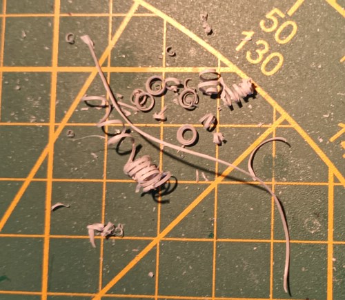 Gedrehte Rohre zu montieren ist etwas tricky, lohnt aber den Aufwand. Plastikrohr möglichst genau abschneiden, Schnittfläche mit der Nagelfeile versäubern, sollte dann eine runde Fläche sein, mit einer Nadel die Mitte anpieksen und ein Loch entsprechend dem Montagezapfen am Rohr bohren, ist meist 0,5mm. Man kann dann ein oder zwei Zehntel größer bohren und mit Sekundenkleber auffüllen, so hat man etwas Spiel zum Ausrichten.