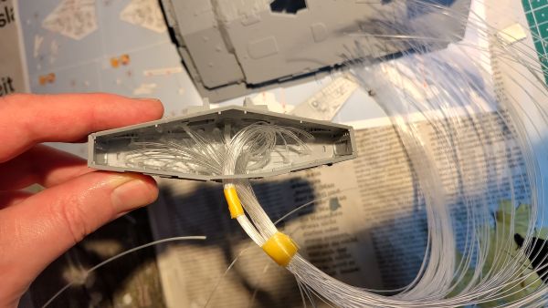 Ganz generell bauche ich vor mich hin und habe keinen sehr detaillierten Plan. Generell bohre ich mit 0,6mm Dremel Löcher für 0,5mm LWL, was ganz gut hinkommt. Ich habe allerdings bis dato viel weniger verbraucht als ich immer so lese. Keine Ahnung, ob das gut oder schlecht ist. Der generelle Plan ist, die LWL zu verlegen, das Modell zu schließen (am liebsten einen Zugriff lassen, weiß aber noch nicht wie), das Modell mit Farbe belegen und dann die überschüssigen LWL außen bündig abtrennen.