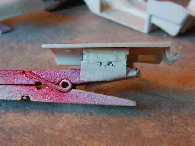 Zum Halten der Teile während der Lackierung habe ich mir auch ein paar Hilfsmittel zugelegt. Diese erleichtern den Lackier- und auch Trockenvorgang ungemein. Wie auf den voran gegangenen Bildern zu sehen, kleb ich die kleineren Teile mit doppelseitigem Klebeband an Wäscheklammern fest. Immer an den Stellen, welche später nicht mehr zu sehen sind. Als Abstandhalter zwischen Klammer und Bauteil habe ich in meine alte Legokiste gegriffen und einen „Zweierstein“ aufgeklebt. Die so präparierten Klammern benutze ich, wie man auch sehen kann, seit vielen Jahren immer wieder.