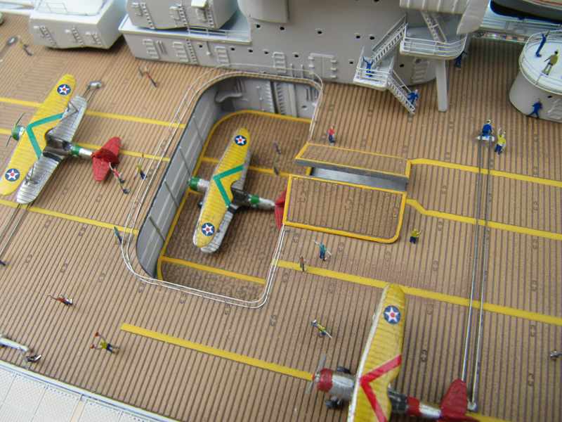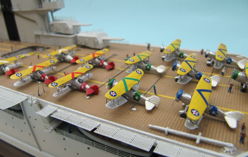 Ebenso die roten Buffalos. Die müsste man nach 1935 der Yorktown zuordnen. Dämlicher weise hatte ich die Buffalo Leitwerke ursprünglich in weiß und habe nachträglich in rot um lackiert um mehr Farbe ins Gesamtbild zu bringen. Also sozusagen absichtlich einen Fehler eingebaut! Zeitlich habe ich für die 36 Flieger genau solange gebraucht wie für das Modell der Saratoga.