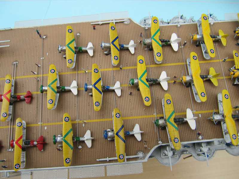 Vor 1935 waren die Farben auf den Trägern bunt untereinander gemischt was aber immer wieder zu Erkennungs- Schwierigkeiten führte. Auf meinem Modell steht auch eine Flight Helldiver mit gelben Leitwerk.