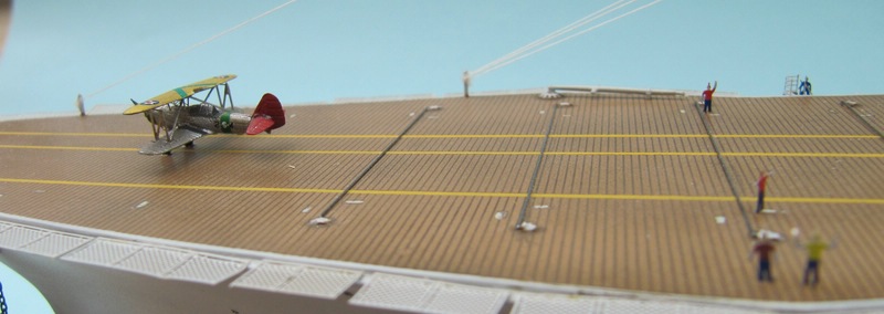 Mit Klebeband habe ich sämtliche Flugdeckmarkierungen abgeklebt und mit Airbrush lackiert. Ganz wichtig ist das Klebeband gut anzudrücken damit keine Farbe in die Plankenzwischenräume hineinläuft. Sonst ist alles zu spät. Ich habe das Gelb in sieben Spritzdurchgängen mit Trocknungszeiten von 5 Minuten dazwischen aufgetragen. Jede Schicht so fein und dünn das nichts von der Farbe in die Fugen einlaufen konnte. Es war pro Lackiervorgang mehr ein dünner Nebel als eine deckende Farbschicht. Die Mühe hat sich gelohnt. Die gelben Streifen sind gut geworden. Mit einer Schablone die ich mir zugeschnitten habe, sind die vier Buchstaben SARA auf dem hinteren Ende des Flugdecks auch lackiert worden. Realistischer als das glänzende Decal sind sie jetzt auf jeden Fall, obwohl das meiste unter den parkenden Flugzeugen verschwindet. Die Fangseile auf dem Deck des Modells sind aus dünnem Stahldraht hergestellt.